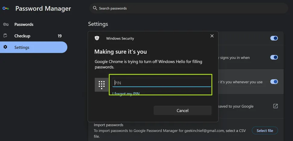 Google Chrome on Windows recently started making you enter a PIN every time you need it to remember your password.